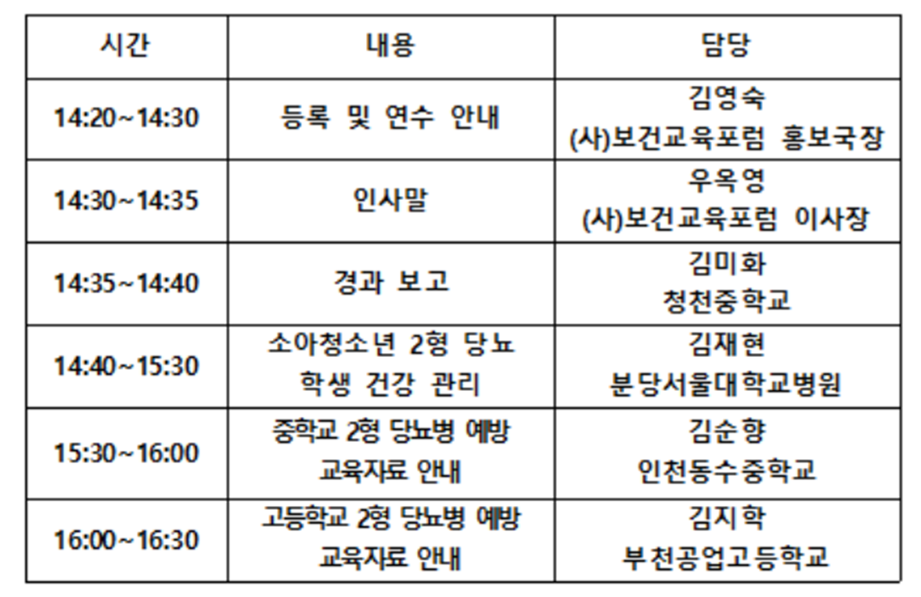 - 주제: 당뇨병 학생 건강관리 및 당뇨 교육자료 온라인 연수 오후 2시 30분